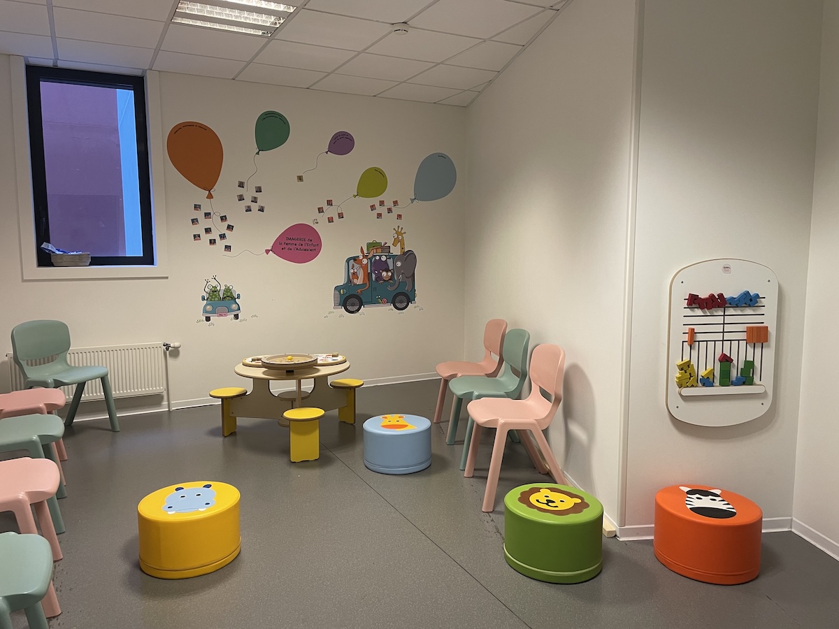 Afin de s’adapter à l’espace disponible, un aménagement a été imaginé par KIDEA Concept. Ainsi, les enfants disposent désormais d’un mobilier ludique et coloré pour transformer le temps d’attente en un moment plus serein.